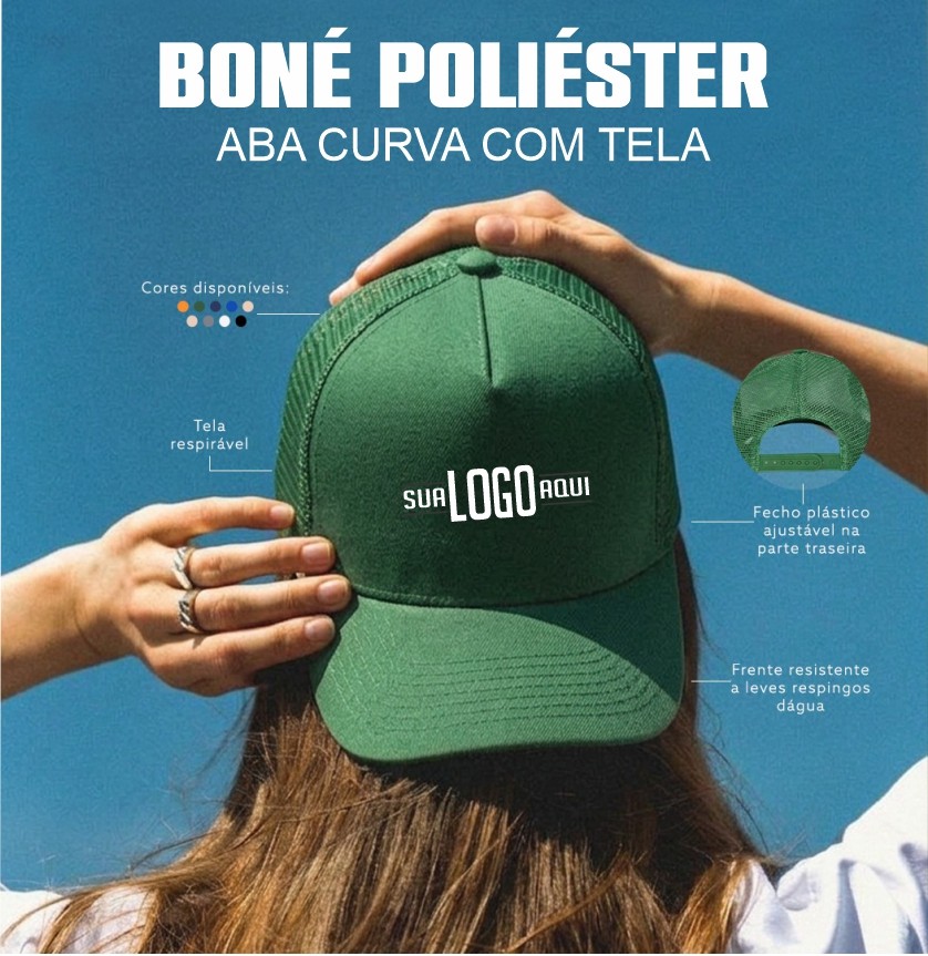 Boné de aba curva em poliéster com parte frontal resistente a leves respingos dágua e tela respirável lateral. Conta com fecho plástico ajustável na parte traseira.
