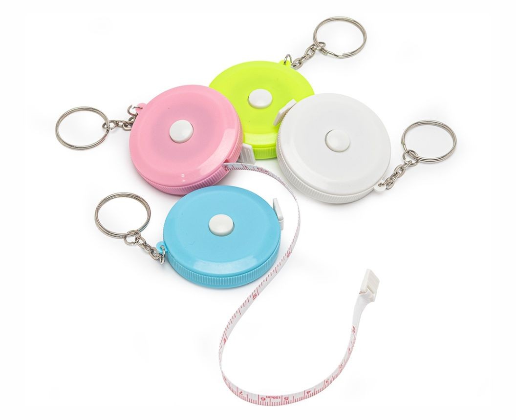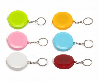 Fita métrica de 1,50 metro em plástico redondo, frente lisa e verso com botão (trava). Acompanha chaveiro.