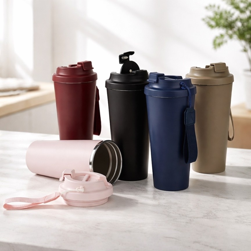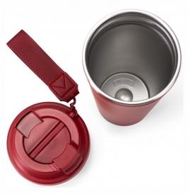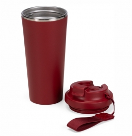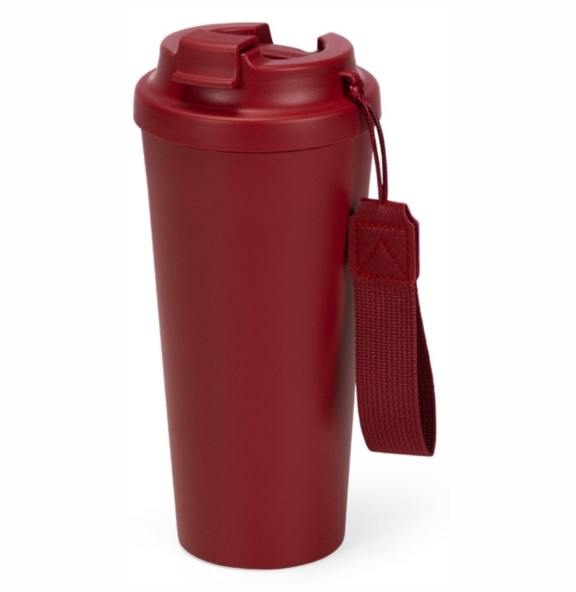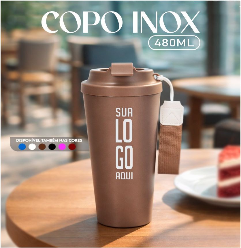 Copo em inox 304 com revestimento externo em polipropileno (PP) e capacidade para até 480ml. Apresenta tampa rosqueável em PP livre de BPA com protetor para o bocal. Acompanha alça em nylon com detalhe em couro sintético para transporte.
