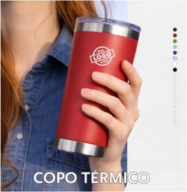Copo térmico em aço inox 304, com capacidade máxima de 550 ml. Apresenta construção em parede dupla e tampa plástica de pressão, com sistema não rosqueável, proporcionando fechamento eficiente, dificultando vazamentos. Conta também com anel de vedação e protetor deslizante para o bocal, que contribuem para a qualidade da bebida.