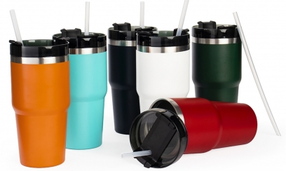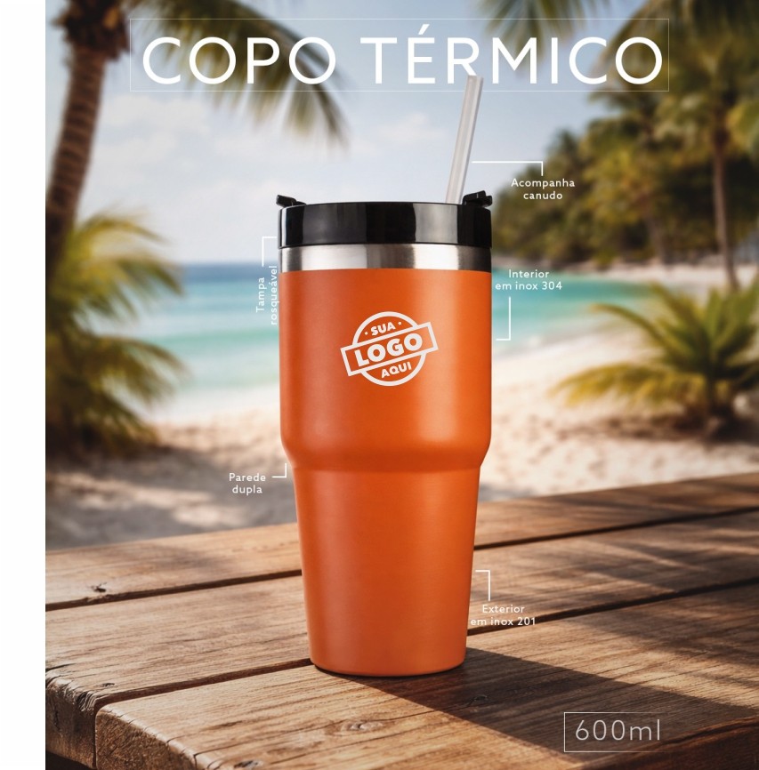 Copo térmico com capacidade para até 600ml. Possui estrutura de parede dupla com interior em inox 304 e exterior em inox 201, tampa rosqueável em polipropileno (PP), com abertura por mecanismo giratório e entrada para canudo. Acompanha canudo em PP.