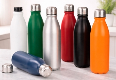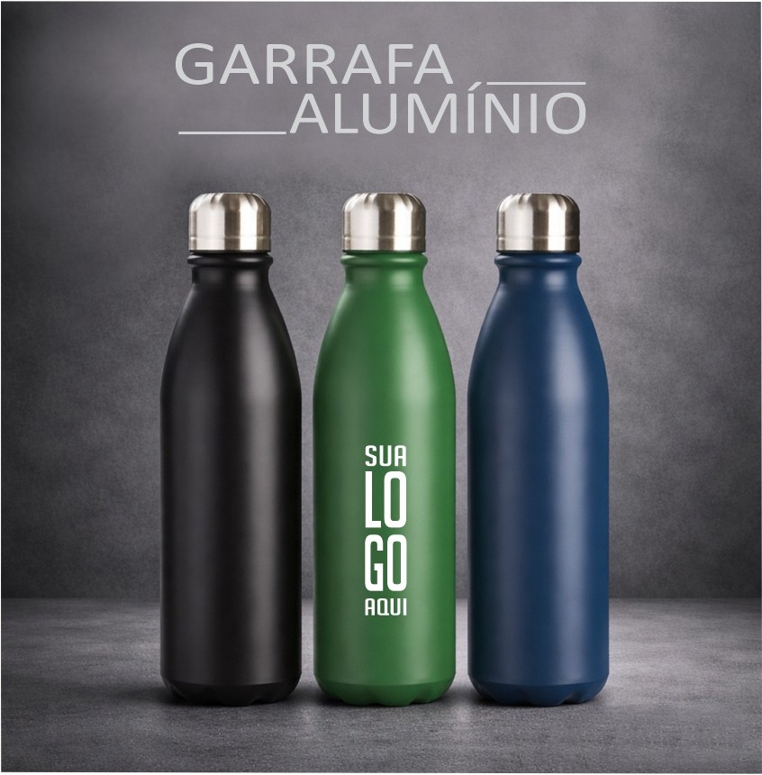 Garrafa em alumínio com acabamento em verniz fosco, revestimento plástico no bocal e capacidade para até 750ml. Possui tampa rosqueável em alumínio com interior em plástico.
